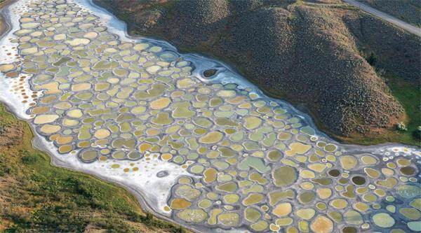 這个酷似调色盘的湖泊位于加拿大,是一个天然盐碱湖。每年夏季,该湖所在地区的温度可达38℃以上,湖水因此大量蒸发、水位下降。此时,水中的矿物质结晶,在湖面形成许多白色“走廊”和颜色深浅不一的浅池,远远望去,湖面上就像绘制了一个个大小不一的多彩斑点,该湖由此得名“斑点湖”。
