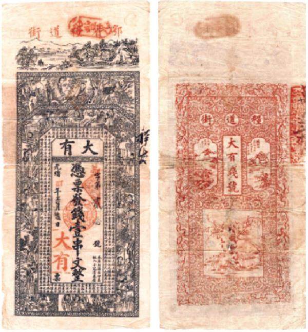 在清代至民国时期,湖北地区的诸多钱庄、商号、社会团体以及个人曾发行过钱票并流通于世。但与邻近的湖南、江西等诸省比较,湖北地区发行的钱票在数量上相对较少,其中尤以清代钱票更为珍稀。比如鄂省粮道街“ 大有钱号”壹串文钱票,就是少见的清代湖北钱票,也是湖北早期石印纸币,颇受民间钱票收藏者、爱好者青睐。