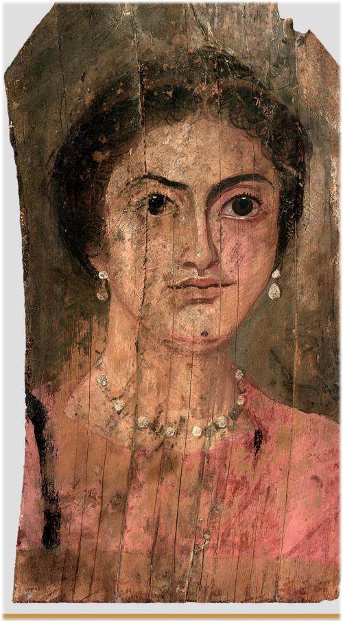 左侧这幅木板肖像画绘制于公元175~200年。画中,有深色头发的妇女戴着优雅的项链和耳环。