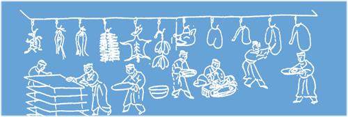 早在周代时就有专门制作腌制品的人了,他们将各类蔬菜用酱、醋等调料拌好,装到坛子里保存。这种整棵被腌制的蔬菜叫“菹(zu)”。《诗经》中说:“我有旨蓄,亦以御冬。”“旨蓄”指的就是腌制好的菜。除了蔬菜,肉类、鱼类也必不可少,古人在整块猪肉(或鱼肉等)上抹好盐,再挂起来风干,获得的咸肉(或咸鱼等)被称为“惰”。大雪时节天气干燥、温度又低,正是制作腌肉的好时节。在一些汉代的画像砖上,我们能看到肉被挂在屋檐下的场景,也许这就是当时的人正在制作腌肉吧。
