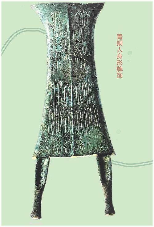 1986年,考古工作者在三星堆遗址二号“祭祀坑”发现了一件外形古怪的青铜器,因为整体看上去像人形,所以考古工作者给它命名为“青铜人身形牌饰”。它整体高度约46.2厘米,很像一个无头无手的人,宽宽的肩膀,身上好似穿了一件长袍或者裙子,下面露出两条腿。每条腿的前侧都向里凹陷,凹陷处有5条平行线,脚踝处也有平行线,但是却没有脚。