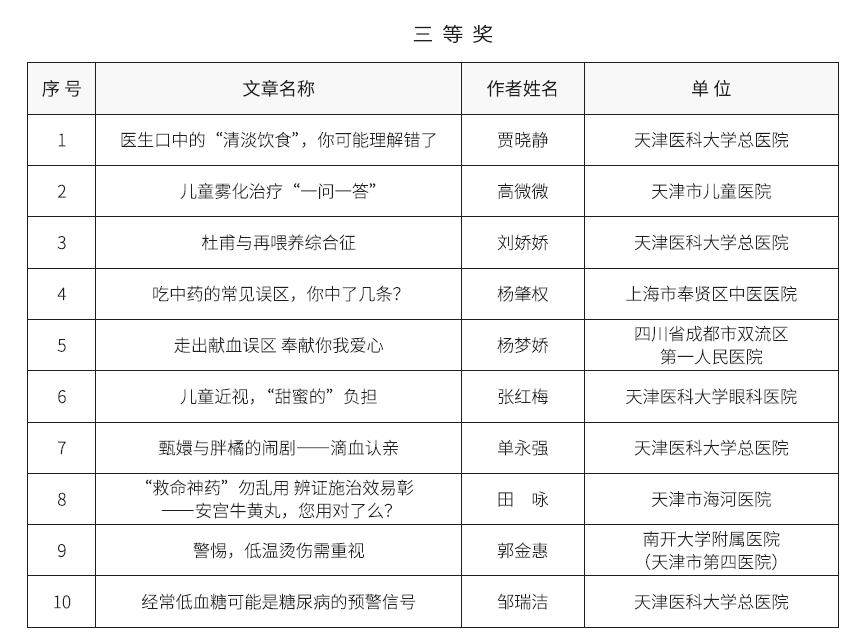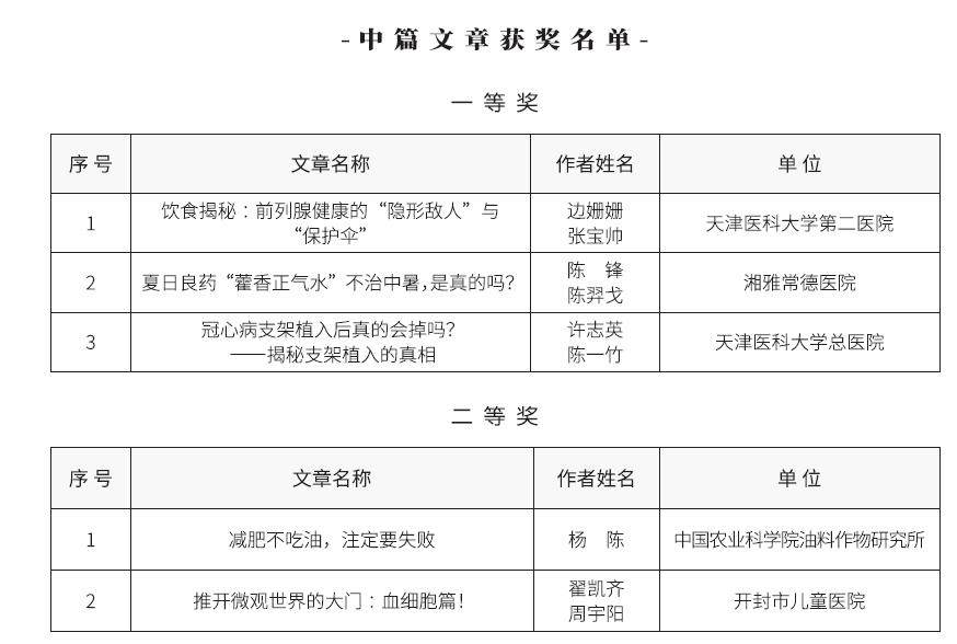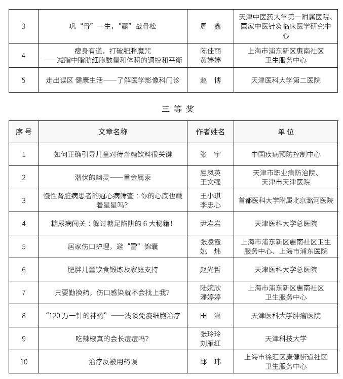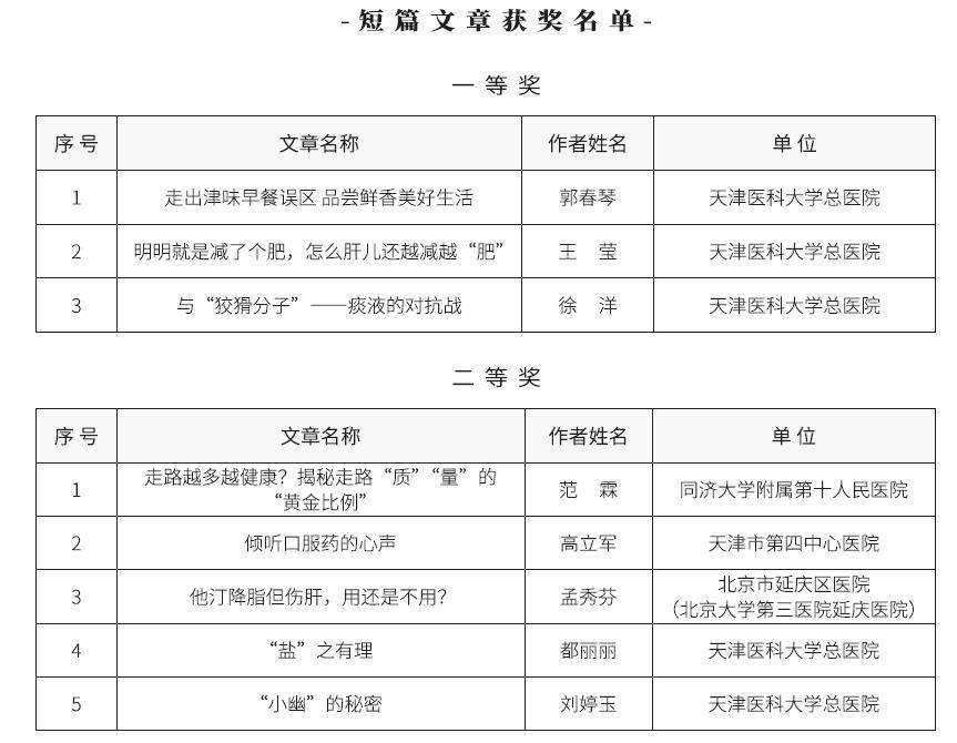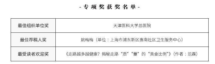 经过专家初评与复评,《走出津味早餐误区 品尝鲜香美好生活》等6篇文章分获短篇、中篇一等奖,《走路越多越健康?揭秘走路“质”“量”的“黄金比例”》等10篇文章分获短篇、中篇二等奖,《医生口中的“清淡饮食”,你可能理解错了》等20篇文章分获短篇、中篇三等奖。天津医科大学总医院获得最佳组织单位奖,上海市浦东新区惠南社区卫生服务中心姚梅梅同志获得最佳荐稿人奖,《走路越多越健康?揭秘走路“质”“量”的“黄金比例”》一文获得最受读者欢迎奖。