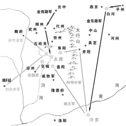 当时,金兵对太原采取了一种以围控为手段的全面打击方法,即在城周围弓箭和石头打不着的地方,将太原城团团围困,并环绕太原城构筑工事,用鹿角连营实施围困,这样不仅切断了太原与其他地方援军的通道,而且有效防止了城内军队突围出去的可能,这就是所谓的坚壁清野。这种围攻方法也确实给太原的防守带来了极大的困难,但以知府张孝纯和副都总管王禀为首的太原军民,不屈不挠,与金兵展开了拉锯战,坚持固守太原,以千百就尽之卒,抵御了百万日滋之师。太原军民在张孝纯、王禀的带领下,在粮草断绝甚至连弓弦与马鞍上的皮革都煮了充饥的情况下,仍没有放弃保卫太原,金兵也一次又一次地被打退。金兵久攻太原不下,就驻留了数万攻城部队继续围困,其他部队绕过太原,继续南进。宋朝官军在金兵铁骑面前,大都无所作为,节节败退,太原日益成为陷入金兵汪洋中的一叶孤舟,形势危急。