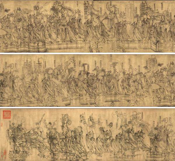 此图作者武宗元,河南孟津人,善画人物。《朝元仙仗图》是北宋初年道观壁画的小样,八十七位神仙构成的队列,去朝谒原始天尊的情节。人物形态各有特色,线条遒劲流畅,衣带飘举,爽爽生风,深得吴道子之风韵。