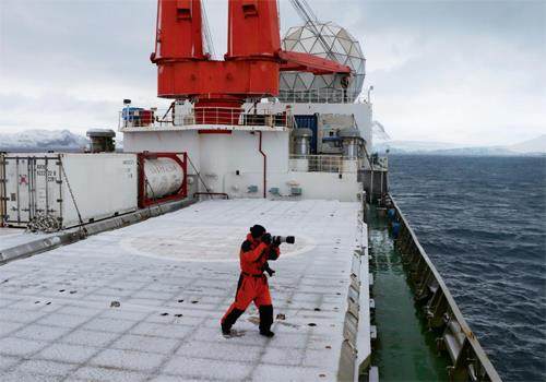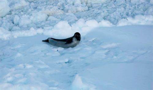 作为一名科考队员,我有幸随“雪龙”号科考船深入南极,亲身感受这片白色大陆的神秘与壮丽,并在此次考察中近距离接触了这种特殊的海洋生物。在“雪龙”号驶入南纬62°以南的浮冰区、直指东南极的普里兹湾时,我曾错失了第一次与海豹邂逅的机会。那是一个清晨,我沿7楼驾驶室外的铁梯下行,准备返回5楼住舱。当我走到护栏边,眼见一块浮冰缓缓向船靠拢时,赫然发现其上覆盖的雪堆里扭动着一只锈色的海豹。彼时,3楼的队员已经发现了它,并迅速举起了相机。而我却因没有携带任何摄影设备,只能眼睁睁地目送那块浮冰驮着海豹渐行渐远。那是我们此次南极科考中,第一次在浮冰上观察到海豹。