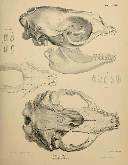 罗斯海豹隶属于食蟹海豹族,这一族群的名称本身就带有“裂齿”或“锯齿”的含义,预示着它们独特的牙齿结构。其吻部前端的尖牙,包括钩状的门齿和犬齿,这些牙齿的特点是不分叉,它们专门用来对付那些在水中快速移动且体表滑溜溜的头足类猎物,如鱿鱼等。而从犬齿往后,则是罗斯海豹独特的滤食结构—对称排列的20枚颊齿。这些颊齿才是其裂齿的典型代表,每一枚颊齿都长有一个主尖头和两个小的齿冠尖头,其造型酷似汉字“山”字。在罗斯海豹咬合时,上下颊齿能够精巧地交错在一起,形成一个如同精密滤网般的“滤食笼子”。通过这个“笼子”,海水可以从镂空的牙缝间顺畅流走,南极银鱼、磷虾等微型猎物就会被高效地截留在口中,最终成为海豹囫囵吞食的美味佳肴。这种高度特化的牙齿结构,使得罗斯海豹能够充分利用南极冰海中丰富的浮游生物资源,是其在极端环境中维持生存所需能量的关键生物学特征。