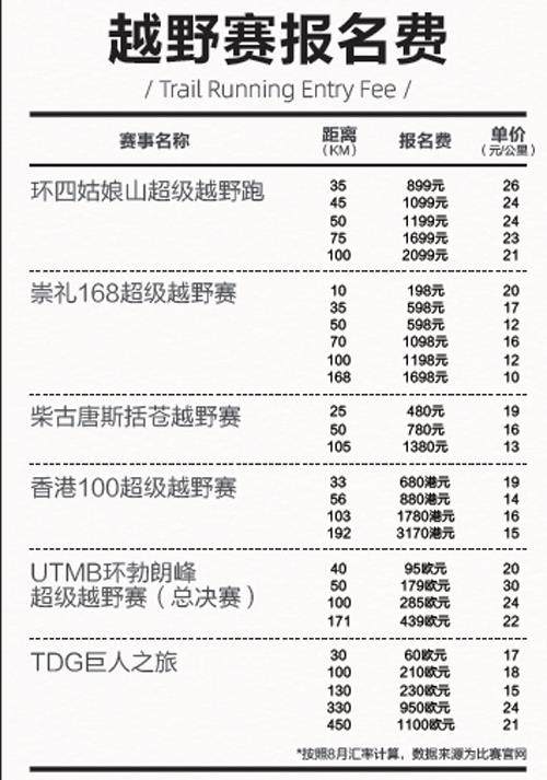 赛事报名费根据赛事品牌和距离有所不同。除少数高海拔赛事,如“梅里100极限耐力赛”因运营成本高导致单价较高外,多数比赛单价范围大部分在10~30元/公里。