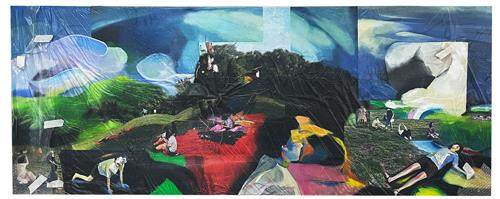 很久之后,我才意识到,他是一个名人,他就是姜思达。那个下午,很多人陆续抵达朝阳公园,他们躺了下来。忘记吧,保持社交距离。一年后,姜思达在美术馆做个展,也把草坪、野餐垫搬到了里面。那副《躺下》的绘画,出现不同躺着的人,他们想要互相接近,但又彼此分开。