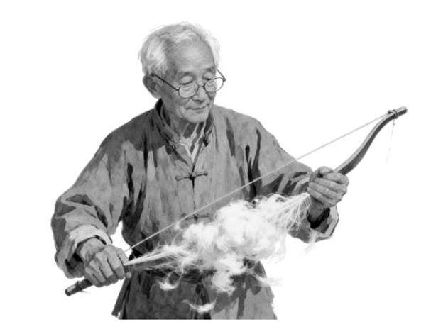 我至今都还清晰记得父亲弹棉花时的样子。他弹棉花的工具是一把木弓和一只木槌。父亲在背后插一枝细竹竿,用绳子把木弓系在竹竿顶端,替持木弓的左手省力。木弓上绷一条牛筋弦,用木槌击打牛筋弦,使其在棉花堆里剧烈振动,便将紧实的棉花“吃”在弦上。然后提起木弓,再击打弓弦,棉花便在剧烈振动中被弹松,一丝一缕地飞离弓弦,鹅毛般飘落在篾席上。“哐、哐、哐,哐、哐、哐……”木槌敲击弓弦的声音,几声清亮,几声沉闷;几声沉闷,又几声清亮,循环往复,节奏均衡。这有着特别韵味的弹花声,蕴含着浓郁的乡土气息,回响在院落街巷里,荡漾在冬日时光中。
