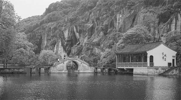 我沿石径行走,转过弯,眼前惊现崖壁陡峭、奇潭幽深、波光滟影。这里原是一座青石山,自汉代始,一代代石匠鬼斧神凿,开山采石,取走了半座山,便成悬崖深潭。此湖在绍兴古城东面,因而称为“东湖”。