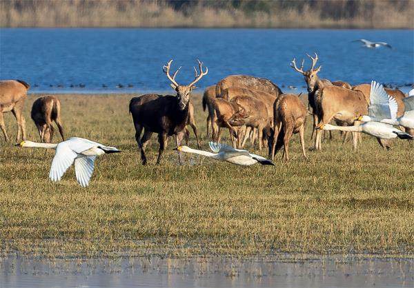 麋鹿又被称为“四不像”,原为中国特有的物种,但清末于国内绝迹。通过40年的物种重引进,湖北荆州的石首天鹅洲湿地麋鹿国家级自然保护区已形成全球最具规模与活力的野生麋鹿种群。