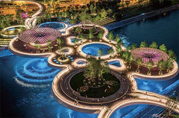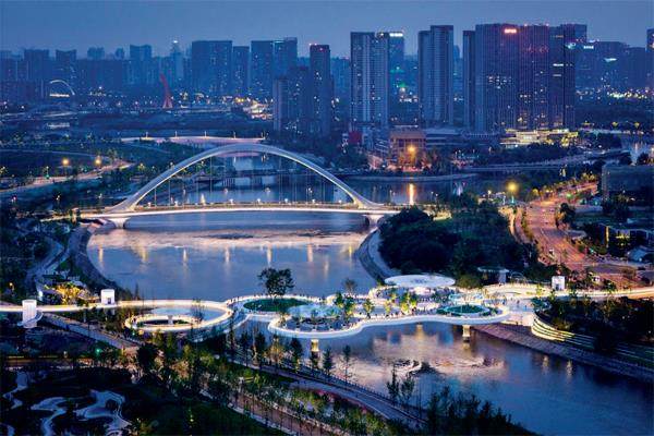 该桥恰好坐落于这一生态交会的节点,以其优雅的姿态横跨锦江,巧妙地将交子公园的东西两区连为一体。320米长度和12000平方米总面积,令交子人行桥成为高密度商圈中一道亮丽的绿色风景线,更是市民们休闲慢行的绝佳去处。