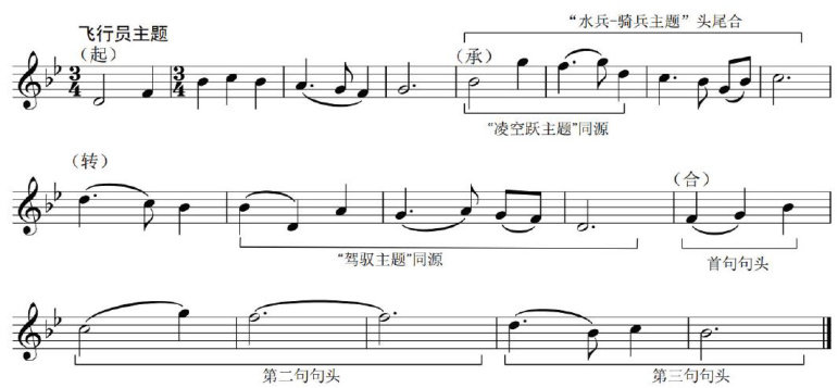 《我爱祖国的蓝天》开头的自然大调定格了歌曲豪爽、乐观的总基调,自然小调式的交替运用则丰富了音乐的多种色彩。乐思从第一乐段稳定的方整结构出发,经过起伏跌宕的旋律发展、派生和高潮中的综合,完成了“飞行员主题”的起一承一转一合,不断增强的结构张力承载了歌曲一往无前的奋进情绪,也赋予作品鲜明的中国气派。歌词以第一人称唱出了战鹰翱翔在祖国长空的壮阔情景,抒发了中国空军的壮志豪情。音乐后续三个主题分别取材于“飞行员主题”的各个部分,既有变化对比又有密切联系的材料发展环环相扣、气韵贯通,一气呵成地保持了情绪的自然流畅,精神气质的完美统一。在词曲结合方面,“飞行员主题”既配合歌词的情景描绘,又以起伏的飞行动态类比着飞行员澎湃的心潮;“驾驭主题”伴随景物的深化表现了飞行员从容驾驭的心态;“水兵一骑兵主题”与歌词内容陈述同步展示了军兵种生活的图景,歌词内容与音乐本体“形似”与“神似”的绝妙搭配令人津津乐道(见谱例1)。