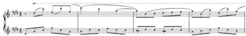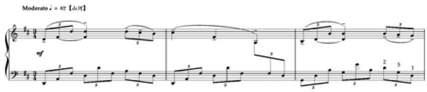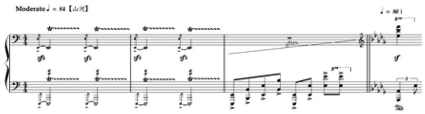 在创作中,张朝并未囿于作曲技法的专业化“楼阁”,而是与更具接受度的音乐话语体系接通,使用流行音乐元素,丰富了作品的风格色彩。笔者第一次视奏这部作品,便生出拓新之感,这一感受源于作品的精妙设计。“山河”“夜曲"两部分的主题旋律巧妙运用级进与大跳音程,和声则以分解和弦三连音的织体呈现,整体简洁明了。于此,流行音乐元素以简易清晰、耳熟能详的乐句语感创新呈现,既保留古典音乐的严谨性,又融入流行音乐的活力,实现古典的理性与流行的灵动交织。这种融合不仅在技术上自然流畅,更在情感上产生了强烈的共鸣。在这样的形式表达与情感铺垫下,“山河"主题旋律自然流畅,亲切温暖,音调中略带丝丝追忆的情怀,瞬间触及弹奏者的心灵深处(见谱例2)。