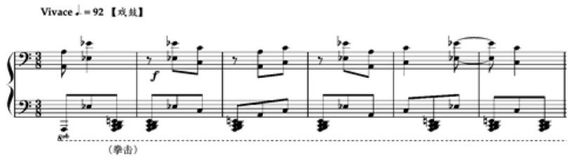 作品序奏部分,钢琴与乐队共同奏响了气势磅礴的宏大音响。在拉弦乐器、竖琴与定音鼓的烘托中,弦乐、弹拨乐与唢呐等吹奏乐器奏出京剧元素的动机,音乐凝重,蓄势待发,营造出旭日东升之势。随着钢琴在低音区双手颤音强有力地进入,似朝阳喷薄而出,展开气势恢弘的序奏(见谱例1)。钢琴与乐队频繁以二度模进的方式协同向上推进,不断将音乐情绪一次次推高,二者高度融合,浑然一体。作曲家在注重钢琴和民族乐器个性的同时,运用娴熟的技巧与深邃的音乐洞察力,将中西乐器的碰撞交融幻化为具有共性的统一和谐的音乐表达。无论是和声、节奏、音响,还是力度的变化以及情绪的推进渲染,它们相互融合,相得益彰,共同构建出一个高度统一且富有感染力的音乐世界。