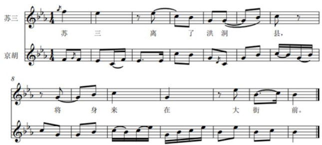 传统戏曲音乐在长期的历史发展中并非稳定不变的静态样式,京剧音乐传统也不是在时间或空间上凝结的静态“景观”。民族音乐学视域中的“声音景观”强调声音在文化构建中的作用与意义,其在时间与空间上的流动性使音乐文化的陈述方式也处于变化之中。京剧音乐脱离原本的形态在不同音乐间的传播移动,以及在传播移动中的变化,形成了其音乐声音景观的流动性。它在流行歌曲中构筑起的形态即为一种重要流动的声音景观。