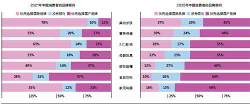 报告最直观的变化发生在品牌偏好层面:4年来,中国消费者在大多数品类上对国产品牌的偏好显著上升。