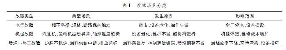 电厂作业环境复杂,故障场景依据故障性质与影响范围可划分为三大典型类别。电气故障以突发性强、影响范围广为核心特点,具体包括相不平衡、短路、断路保护触发等情况,且相不平衡易导致电机过载发热,短路则可能引发配电柜跳闸甚至设备烧毁,断路保护触发多与线路老化或接触不良相关,此类故障若处置不及时,可能造成整个供电系统波动。机械故障主要集中于汽轮机、发电机等核心转动设备,常见表现为振动异常、轴承温度超标,其成因多与设备长期运行后的部件老化、润滑失效或日常维护不到位有关。例如,汽轮机叶片磨损会导致振动幅值超出安全阈值,轴承缺油则直接引发温度骤升,此类故障会直接影响机组出力效率。燃烧与热工故障主要围绕燃料燃烧与热工控制展开,涵盖炉膛燃烧不稳定、燃料供给中断、烟气排放超标等问题。炉膛不稳定多因燃料配比失衡,燃料供给中断可能源于输送管路堵塞,排放超标则常与控制逻辑错误导致的空气过量或不足相关。此类故障不仅影响机组热效率,还可能违反环保排放标准[1]。具体如表1所示。