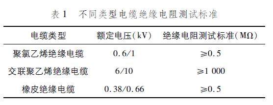 需严格执行进场验收制度,重点检查电缆阀门等关键材料设备,需对电缆开展绝缘电阻测试工作,且其标准值应在0.5 MΩ。为确保质量符合要求,阀门需开展密封试验,且试验压力设定为工作压力的1.5倍。不同类型电缆绝缘电阻测试标准如表1所示。
