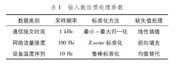 输入数据需经差异化预处理,如表1所示。通信报文时延采用最小-最大归一化消除量纲差异,网络流量强度通过Zscore标准化抑制突发噪声,设备温度序列使用鲁棒标准化降低异常值干扰。