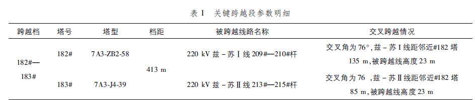 182#—183#铁塔放线段为本次工程的关键跨越段,档距为413 m,涉及对220 kV兹-苏Ⅰ线、Ⅱ线这两条送电线路带电跨越施工,具体参数如表1所示。