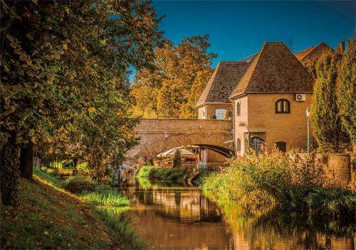 城堡的塔楼高耸,直刺蓝天,外墙由赭红色砖石堆砌,四周围绕着护城河。登上城墙远眺,视野豁然开朗:下方是小镇连绵的红瓦屋顶,远处是蜿蜒流转的碧蓝河道,河流两岸的绿树随风摇曳,映衬着远处微微起伏的丘陵。
