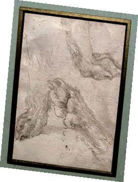 走进展厅,你们就会看到展墙上展出着的一幅稿纸泛黄的素描画,这是我在1490 年前后画的《狗爪素描习作》。你们仔细观察这幅画,能清晰地看到狗爪的肉垫呈现立体的弧度和趾缝间细碎的毛发。