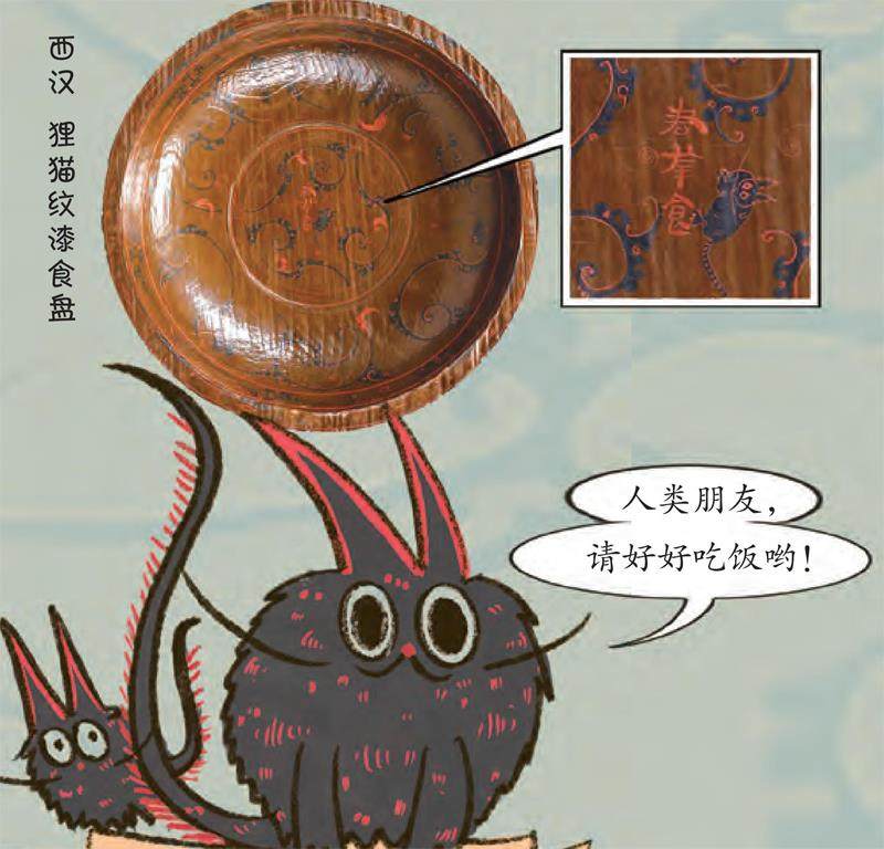 我是西汉时期的狸猫纹漆食盘,出土于湖南长沙马王堆汉墓。盘心绘有憨态可掬的狸猫图,狸猫图旁边朱漆书“君幸食”三个字,意为“请您尽情用餐”,这既体现了主人待客的真诚心意,也是对食客的美好祝愿。
