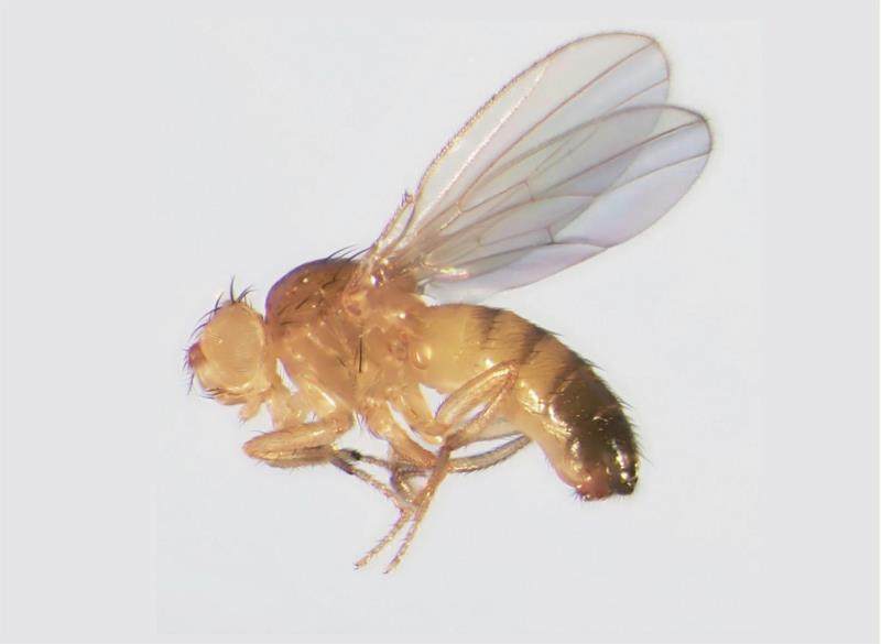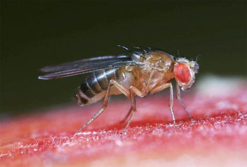 黑腹果蝇小巧玲珑,总体呈淡黄色,腹部有黑色横纹,翅膀透明,眼睛是复眼且呈鲜红色或白色。黑腹果蝇的成虫体长约2~5毫米,体重约1毫克,雌性略大于雄性。雌性腹部末端呈钝圆状,无性梳特征,而雄性腹部末端具黑色环纹和性梳结构,且前肢特化后用于交配行为,人们可通过这些特性来区分雌果蝇和雄果蝇。