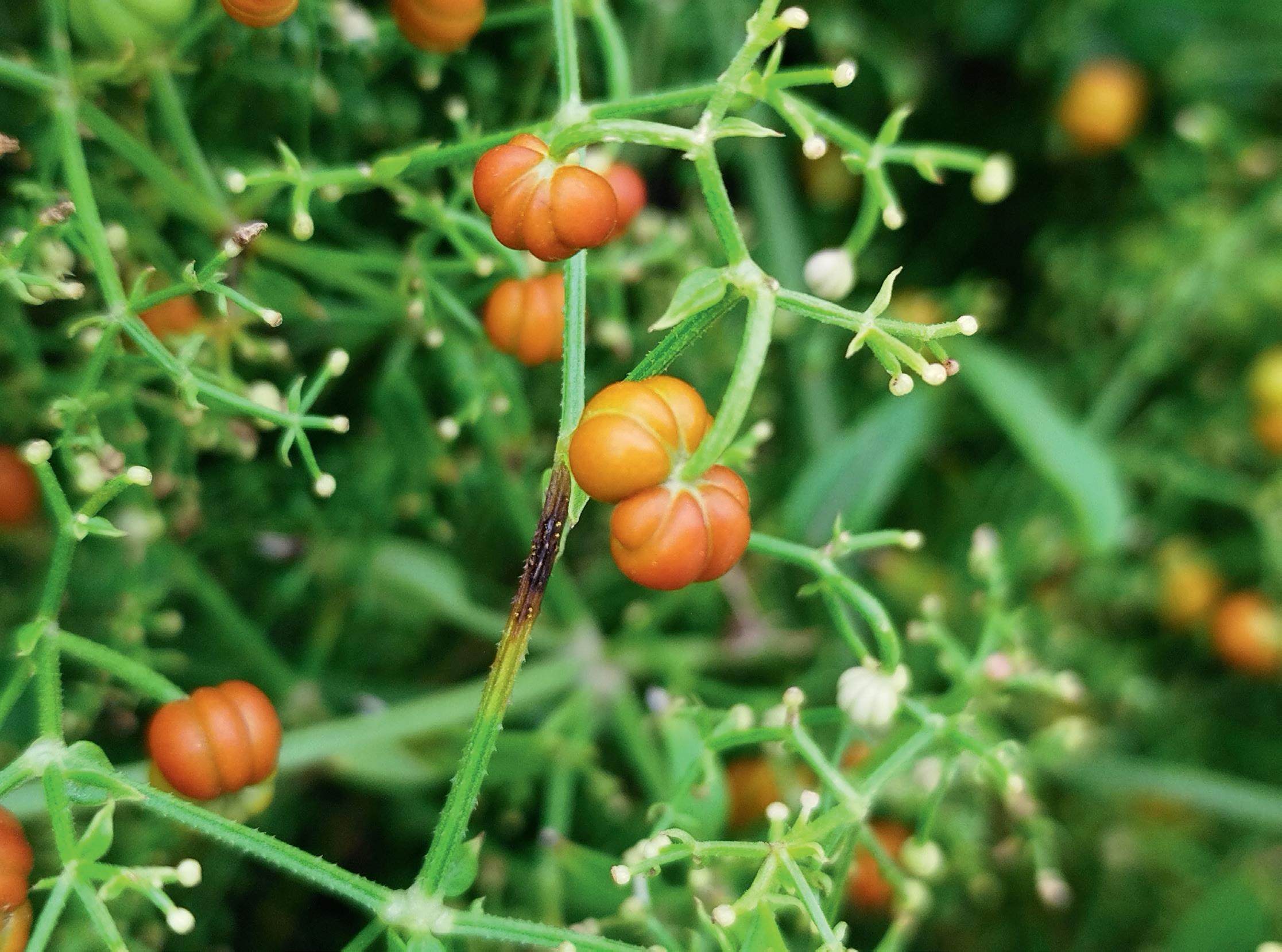 茜草的肉质浆果迷你可爱,呈小球形,直径通常为4~5毫米,初为橘黄或红色,成熟时转为紫黑或黑色。花期在7—9月,果期在9—10月。