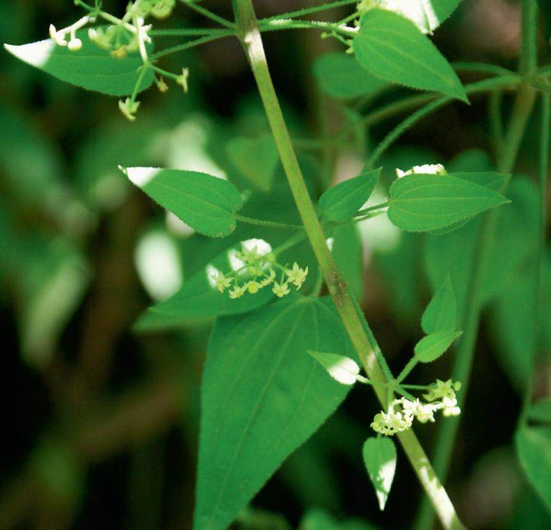 单看茜草的每一片叶子,似乎并无太多亮点,细细观察便会发现不同,其叶片通常以4片一组的方式排列,如同一把把指向四方的长矛,形态舒展地间隔轮生在同一枝条上,每片叶子还有细长的叶柄,成为在野外辨认这种植物的最直观特征。