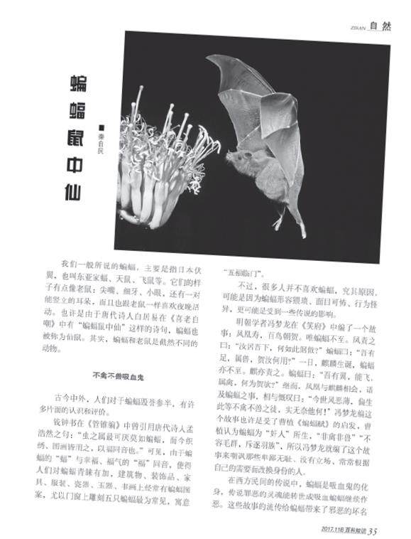 ③不过,很多人不喜欢蝙蝠,可能是受到一些传说的影响。明代学者冯梦龙在《笑府》中编了一个故事:凤凰寿,百鸟朝贺。唯蝙蝠不至。凤责之曰:“汝居吾下,何如此倨傲?”蝠曰:“吾有足,属于兽,贺汝何用?”一日,麒麟生诞,蝠亦不至。麒亦责之。蝠曰:“吾有翼,属于禽,何为贺与?”麒凤相会,语及蝙蝠之事,互相慨叹曰:“如今世上恶薄,偏生此等不禽不兽之徒,真个无奈他何!”这个故事嘲讽了那些卑鄙无耻、没有立场的人。