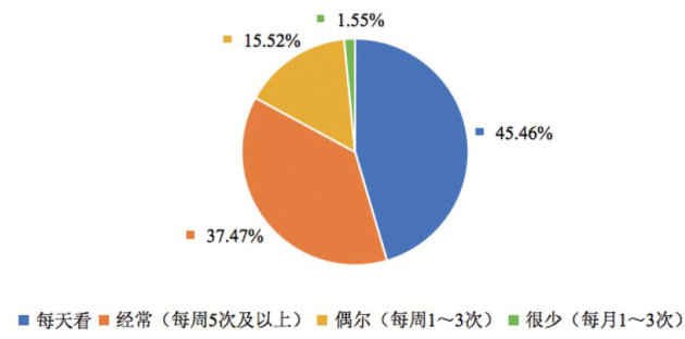 1.观看习惯:从“特定时段”到“日常陪伴”。观看习惯作为用户使用决策的基础环节,直接反映电视大屏在用户日常生活中的渗透程度与重要性。研究发现,电视大屏的使用呈现高频高黏特征,且使用场景已从传统“特定时段”转向“日常陪伴”。从使用频率看,以“高频陪伴”为核心关键词,每天观看(2173人)与经常观看(每周5次及以上,1791人)的用户合计占比达 82.93% ,超八成用户将电视大屏视为日常娱乐放松的常规选择(如图1)。即便在多屏分散注意力的环境下,大屏仍凭借家庭场景沉浸感、适合共享的特性及内容服务优化,保持高用户黏性。