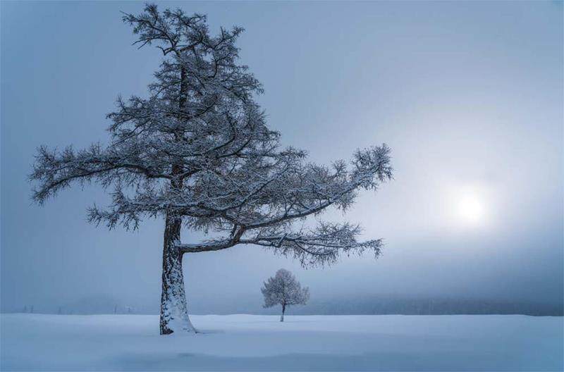 树木的生存姿态悄然触动了我,也潜移默化地重塑了我对生命的理解。曾经,我重返坝上雪原,拍摄出《呵护》这组照片。画面中,两棵树相距甚远,看似各自孤立,但稍微移动视角,可以看到大树仿佛将旁边的小树拢入怀中,两棵树相互依偎,充满温情。后来,那棵大树在风雪中折断枝干,但却依然传递出一种由内而外的坚韧。正是这种力量让我一次次驻足凝视,将它们的形与神收入镜头,刻入记忆。