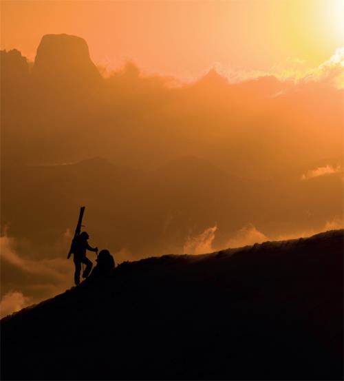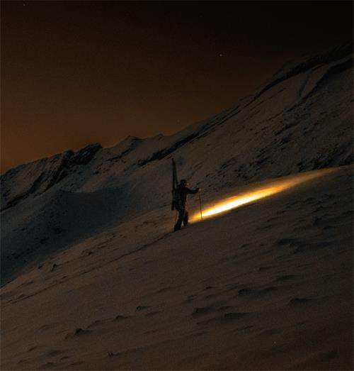 拍摄于2025年11月17日,汗斯正在黎明前爬上难度最高的滑行路线山顶。 摄影师 | 秦同辉