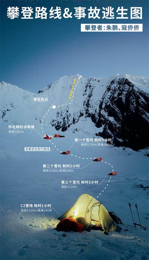 朱鹏往下看了看。下方大约100米处,可以隐约看到第三个冰裂缝,从这个冰裂缝再往下,地形就会平缓很多。他估算着距离,“当时心里有赌博的成分,只要到达那里,我们就能确保安全下山。因为最后一个冰裂缝到底部,坡度就只有20多度,走都能走下去。”