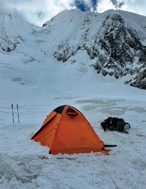 消失不见的雪锥,只作为小插曲让朱鹏心里犯了一阵嘀咕。大雪过后,一场雪崩从勒多曼因峰上倾泻而下,将山体冲刷得很干净,路线变得更加清晰。“一般在雪崩过后就不会再发生第二次雪崩。”朱鹏分析道。加上天气特别好,两人都对这次攀登抱有很大信心。但出发前,侨北还是不忘叮嘱一句:“我们这次不着急,稳妥一点。”话里也带着几分给自己的暗示。他们太了解彼此了,骨子里都是个“激进派”。