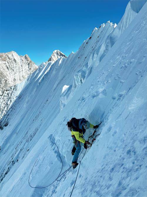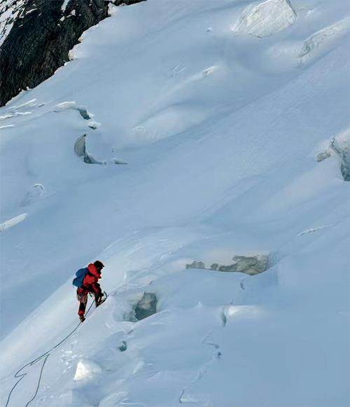 从第一个冰裂缝之上开始,地形迫使他们的攀登方式从结组行进转变为交替先锋。一对60米双绳子,一人先锋建站,另一人跟攀、拆站,如此反复。这种方式安全,但极其耗时。两人互相提醒,一定要稳一点,千万不要滑掉。攀登本身异常顺利。天气近乎完美,无风,视野开阔。难点的那段陡冰,他们也有惊无险地通过。