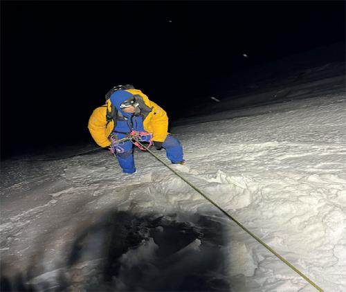 白天上来时,这里是一个坡度约30~40度的雪坡,两人结组通过,不需要设置保护点。朱鹏当时心里其实“有点打嘀咕”,因为那根丢失的雪锥,他盘算着下撤时或许可以利用旁边的岩石做保护站。但此刻是黑夜,原本不大的坡度,现在看起来却有些陡峭,头灯的光在雪面上反射,距离感和地形判断都变得模糊,一切跟原本想的不一样了。更关键的是,他们找不到白天看到的那块可以用来建保护站的岩石。
