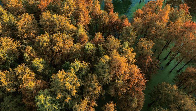 水松高可达25米,树干通直,基部常膨大呈板状根或纺锤形,这是为了在松软的淤泥中稳固身形;露出水面的“呼吸根”是其标志性特征,这些从侧根长出的肉质根向上伸展,能在缺氧的淤泥中吸收空气,堪称“水下呼吸神器”;它的叶形极具特色,一株树上会出现3种叶型——鳞形叶紧密贴生于当年生小枝,条形叶和钻形叶则生于长枝或短枝上,这种“异形叶”现象是对光照、水分的灵活适应。叶片翠绿鲜亮,冬季部分叶色转为红褐色,四季皆有观赏价值;水松雌雄同株,球果近球形,成熟时呈褐色,鳞片木质化,每个鳞片内含有2粒带翅的种子,可随风或水流传播,延续种群生命。