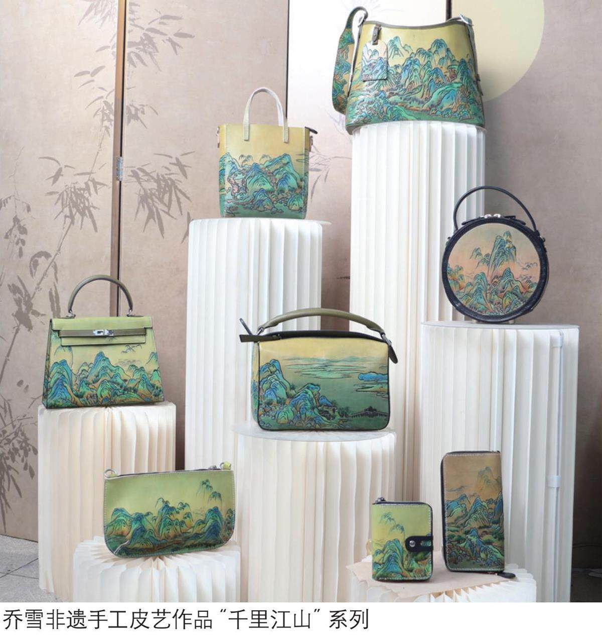 该作品雕工细腻、藏密于简——远看是山峦,近看是水纹,以皮雕表现水墨的皴法,让青绿山水在牛皮上“呼吸”;色彩还原逼真,惟妙惟肖地再现了原画作中千里江山的壮阔之景:山峰层峦叠嶂,江水烟波浩渺,山水乔雪创作皮艺制品 间屋舍村落、楼阁亭榭等错落有致,以传统皮雕技艺再现《千里江山图》的东方美学意境。在峰会首日,这件作品便被中国妇女儿童博物馆列入永久收藏名单。