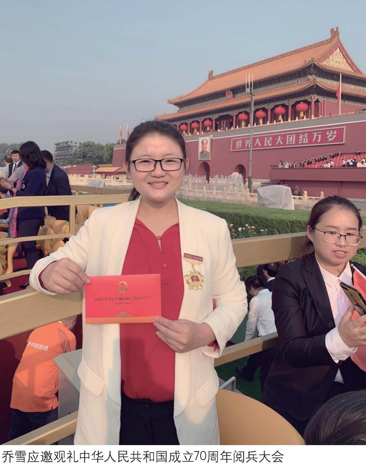 2019年10月1日,作为非遗传承人的杰出代表,乔雪应邀在天安门广场观礼中华人民共和国成立70周年阅兵大会。她身着红色上衣,手持一面纸质国旗,在观礼台就座。她说,最大的感受就是民族自豪感。“身边都是在电视里才能见到的人,还有一些跟我一样的普通人,像公交车司机、治沙老人。虽然我们是普通人,但是我们干的这份事业,只要做好、做到极致,是能够被大家所看到的,就是最自豪的事情。”