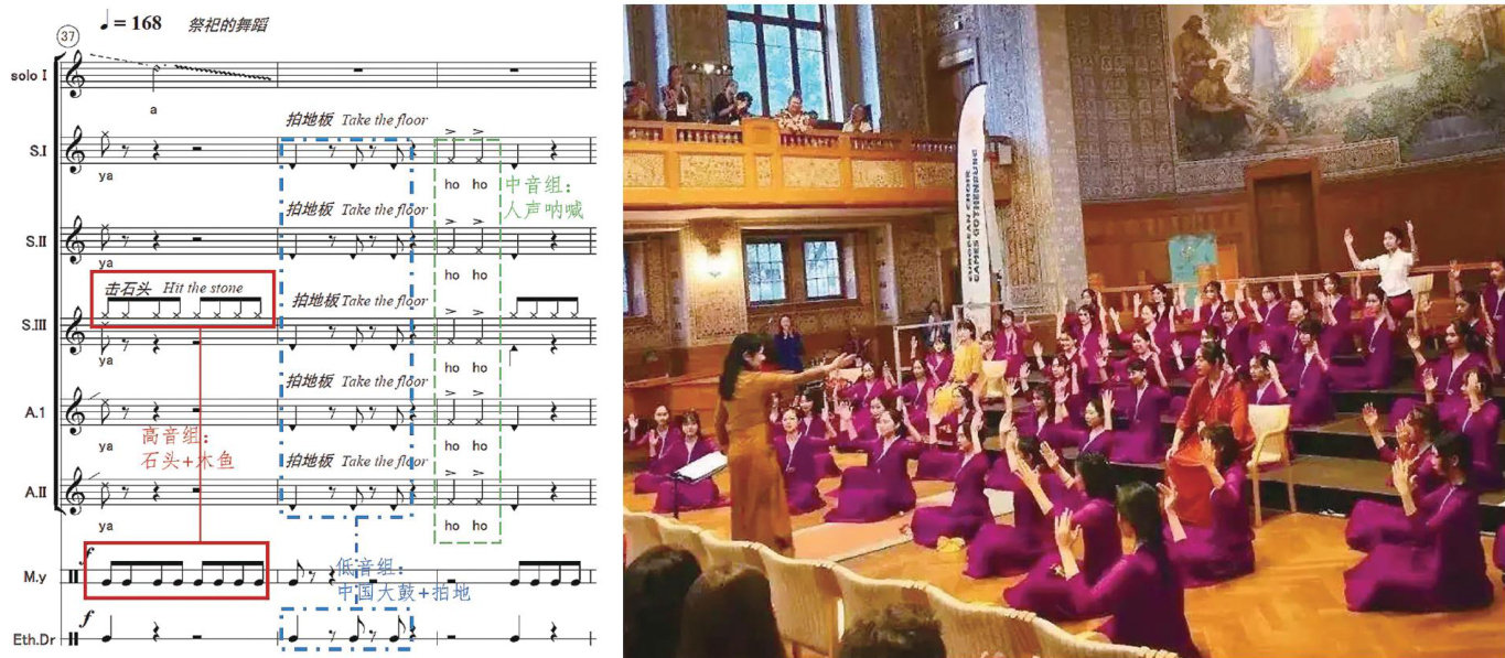 值得注意的是,刘晓耕在创作中突破了以音高为中心的传统合唱思维,将音乐的核心聚焦于节奏律动。在他看来,节奏不仅是音符的排列方式,更是仪式感与原始生命力的体现。比如,第37小节展开了全曲最具震撼力的片段。此处的节奏性材料被划分为三组层次:高音区——石头与木鱼交织成清脆尖锐的复合音色;低音区—中国大鼓与地板拍击发出低沉厚重的脉动;中音区一合唱团员口中爆发的刚劲有力的“ho-ho”声响(见图5)。三组声响在空间上彼此呼应,层层叠加,营造出“天、地、人”相互映照的意境。这种音响设计不仅在感官层面上形成强烈的震撼力,更在思想层面折射出刘晓耕的创作理念一音乐不是孤立的音高堆砌,而是承载文化象征与精神秩序的声音建构。他将原始仪式的野性力量与现代合唱的逻辑结构融为一体,使作品超越单纯的声响效果,成为对生命秩序与文化根源的当代表达与艺术化呈现。