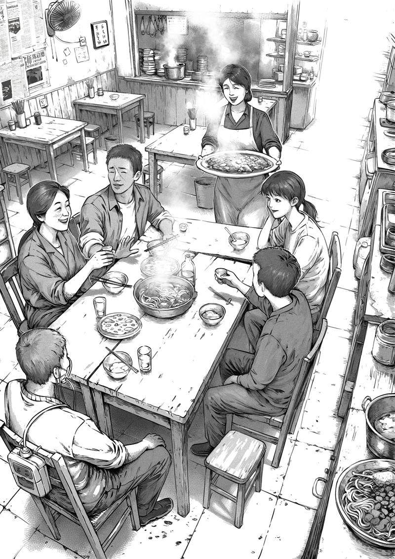 汤锅又开了,儿子尝了尝,微微点了点头,仿佛对刚才加的那瓢水很满意,接着去前面把卷帘门打开,早就等在门口的食客们鱼贯而入,分头寻找自己相中的座位。灶台旁边的点单机持续不断地吐出订单,繁忙的工作要开始了。