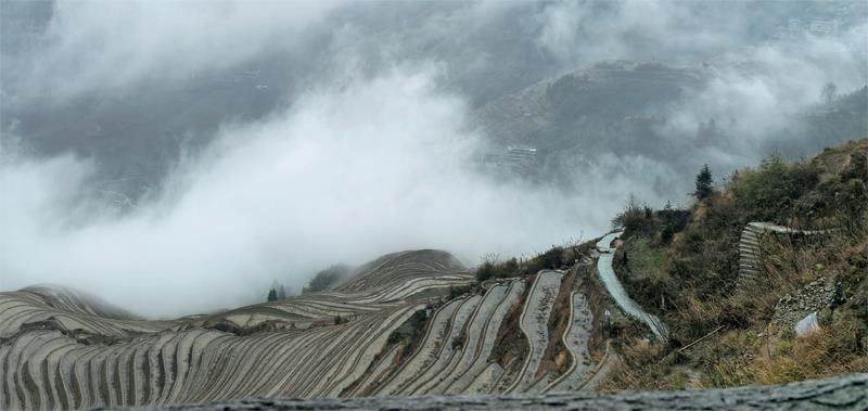 从桂林市区驱车向北,绕过蜿蜒曲折的山路,经过大约1个小时的车程,龙脊梯田便层层铺展在眼前。远远望去,蓄水待耕的田垄在晨光中泛着银光,田埂的线条看上去婉转而坚韧。