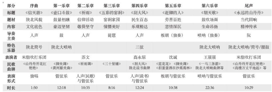 大型民族管弦乐组曲《永远的山丹丹》,以黄土高原上的“山丹丹"为核心意象,将其坚韧的生命特质转化为对陕北人民精神力量的艺术表达,构建出主旨鲜明、结构严谨的音乐叙事。作品既具备专业化的形式高度,又葆有直抵人心的情感温度,不同背景的听众,皆能在音乐的跌宕起伏间,触摸黄土大地的厚重质感,感受陕北人民蓬勃的生命力。②沉浸于现场聆听的真切感受,笔者将以听觉体验为出发点,从五个相互关联的层面,解读作品的艺术亮点,总结其为当代民族音乐创作提供的有益经验。