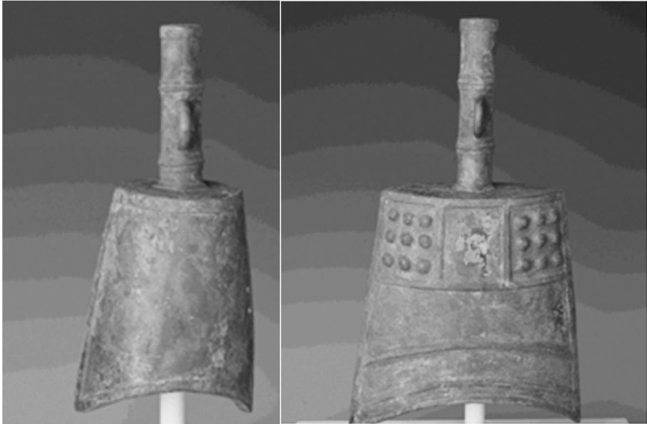 图一海昏侯墓两件军乐器(左为标本M1:1368,右为标本M1:1369)