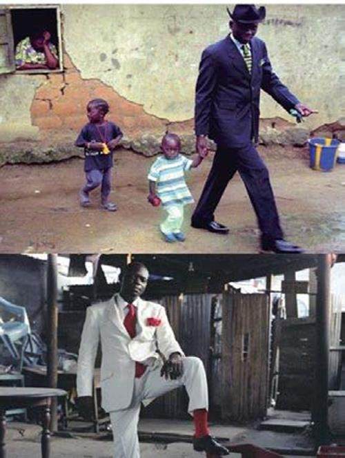 这些衣着考究的先生们,可并不是刚刚完成交易的商务人士来这儿庆祝,他们可能是刚果的每一个普通人——出租车司机、木匠、工人、警察,他们在阳光明媚的星期天下午聚集在这里,像所有的星期天一样,秉持着共同的信念:考究得体的穿着是自我升华,是救赎,是福音。一件欧洲手工定制时装,有可能花掉他们几年的积蓄;甚至于他们之间经常要互相借穿衣服,以满足更换搭配的需求。有些评论者认为,如果他们愿意用置装费去投资,生活一定能过得更好。然而对于他们来说,穿得体面比吃顿好的更让人精神满足。