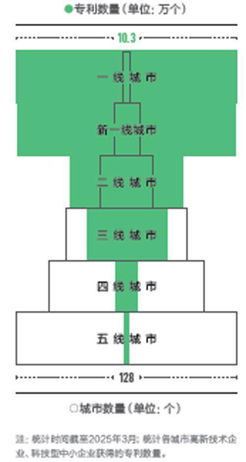 专利数量直观反映了技术成果转化和市场应用的效果。截至2025年3月,上北深广四大一线城市由重点企业产出的专利数量约占全国总量的1/3。从一线城市到新一线城市,再到二三线城市,各线级城市的专利产出规模依序大幅缩减,高质量、高密度的科研产出依然被头部城市垄断。