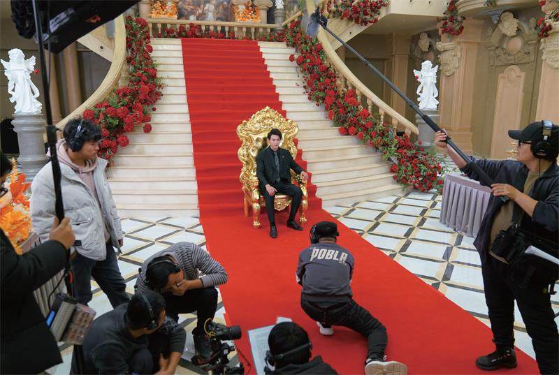郑州一家高档酒店内,演员与剧组人员正在拍摄短剧
